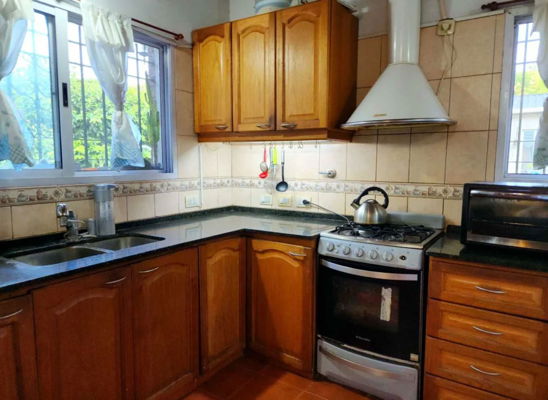 Este espacio nos deposita en el amplio estar comedor, con cocina semi integrada. El estar comedor posee una estufa hogar que termina de darle el detalle de calidad y confort que se percibe cuando uno llega a la propiedad. Completan 2 dormitorios y un baño completo con ante baño. La cochera cubierta para 2 vehículos, al ser pasante, permite albergar todavía más vehículos. El patio con verde nos conduce al amplio quincho de aberturas amplias, muy cómodo y equipado con cocina, lavadero, parrilla y baño, es el lugar elegido por la familia durante la mayor parte del año.