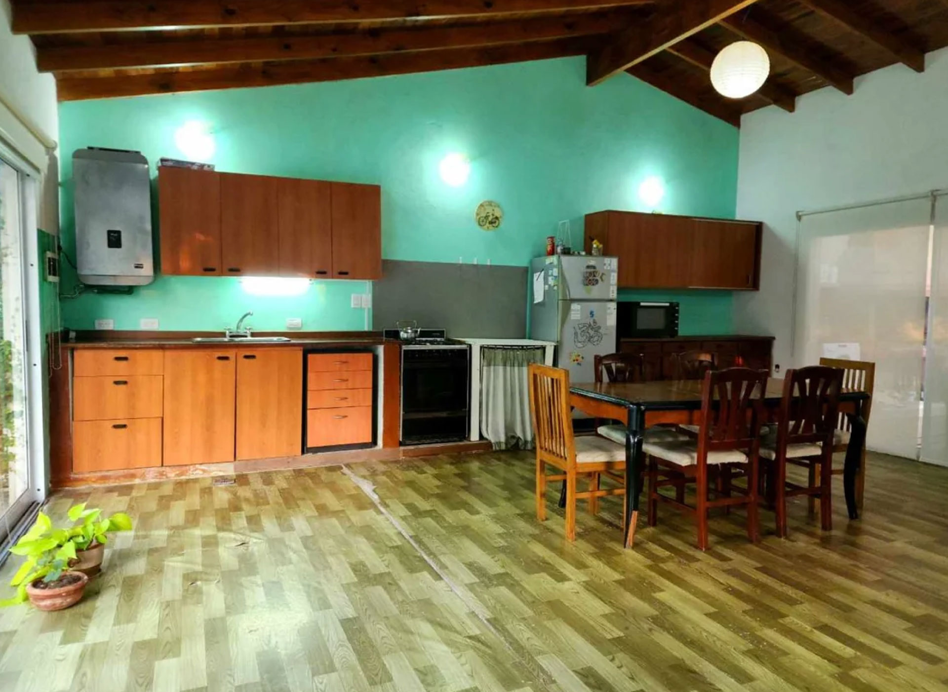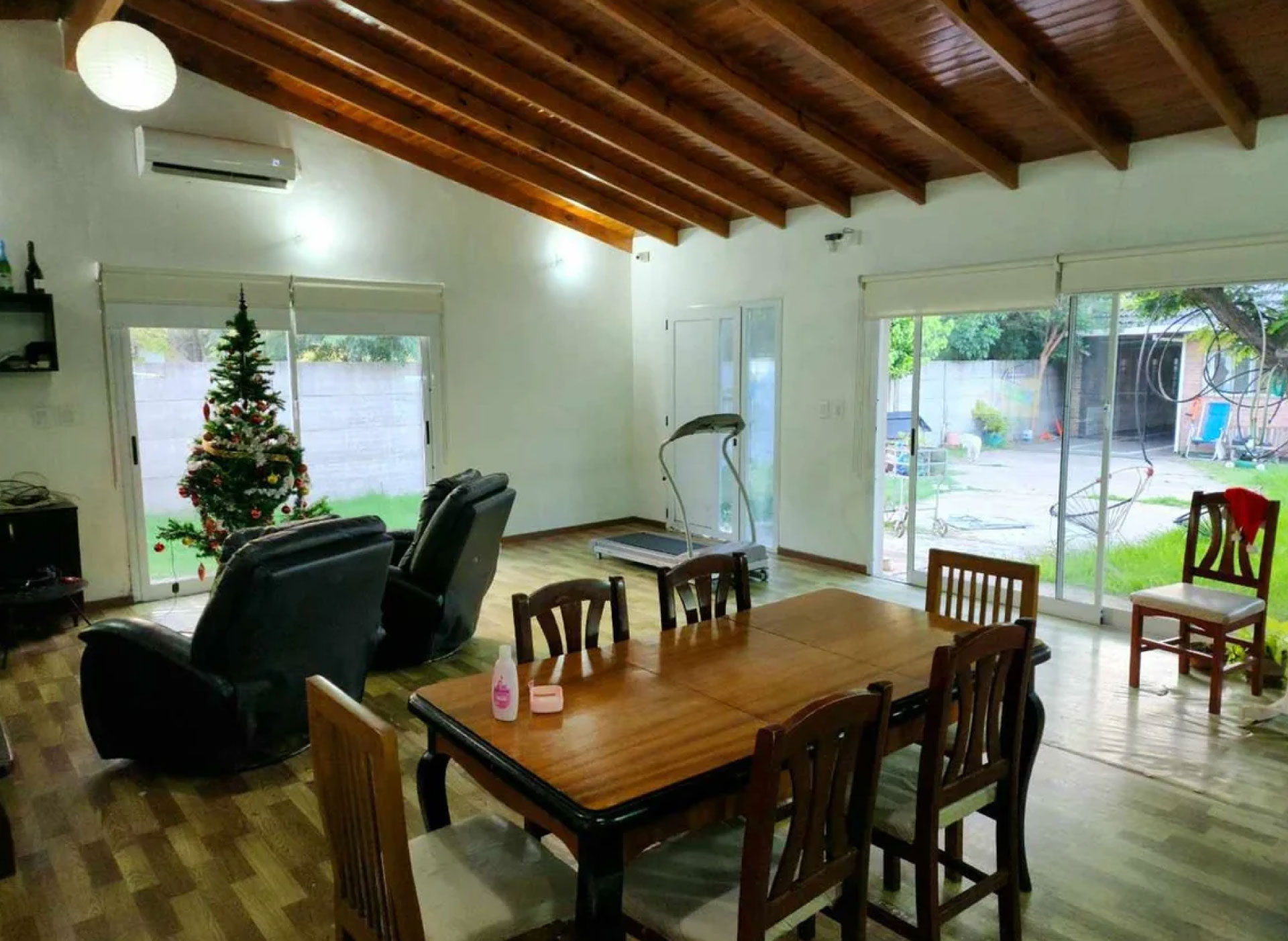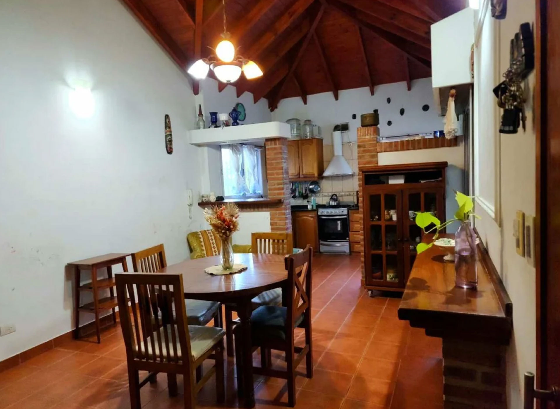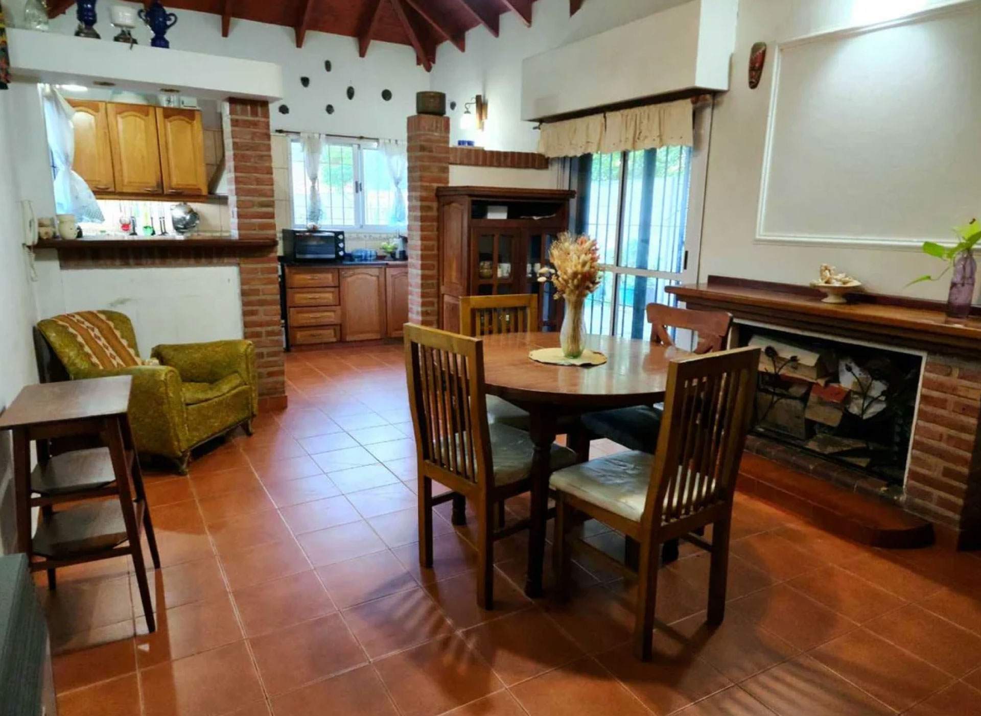 Este espacio nos deposita en el amplio estar comedor, con cocina semi integrada. El estar comedor posee una estufa hogar que termina de darle el detalle de calidad y confort que se percibe cuando uno llega a la propiedad. Completan 2 dormitorios y un baño completo con ante baño. La cochera cubierta para 2 vehículos, al ser pasante, permite albergar todavía más vehículos. El patio con verde nos conduce al amplio quincho de aberturas amplias, muy cómodo y equipado con cocina, lavadero, parrilla y baño, es el lugar elegido por la familia durante la mayor parte del año.